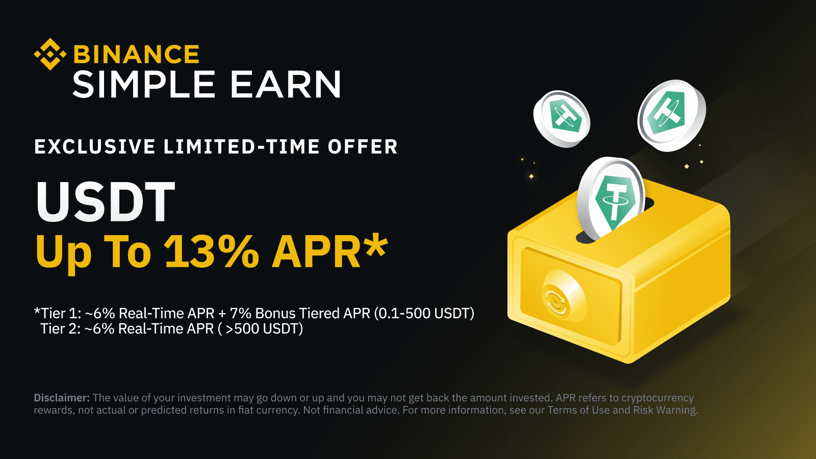 wir von Binance Simple Earn freuen uns, eine USDT-Aktion für flexible Simple Earn-Produkte zu starten! Nimm während des Aktionszeitraums USDT-Anlagen in flexiblen Simple Earn-Produkten vor, um zusätzlich zu den Echtzeit-APR-Belohnungen (d. h. ca. 6 %) einen exklusiven gestaffelten Bonus-APR von 7 % zu erhalten.