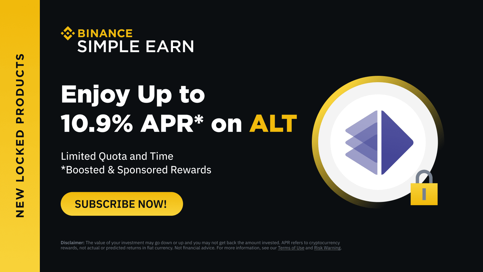 Binance Simple Earn anuncia el lanzamiento de AltLayer (ALT) en los productos Bloqueados. Suscribe ALT a los productos Bloqueados de Simple Earn durante el período de la promoción para obtener hasta un 10.9% en recompensas de APR.