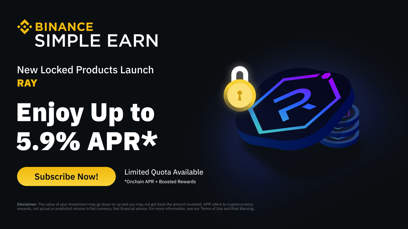 Binance Simple Earn introduce RAY en los productos Bloqueados. Completa suscripciones de RAY a partir del 4 de enero de 2024 a las 12:00 (UTC) para ganar hasta un 5.9% en recompensas de APR.