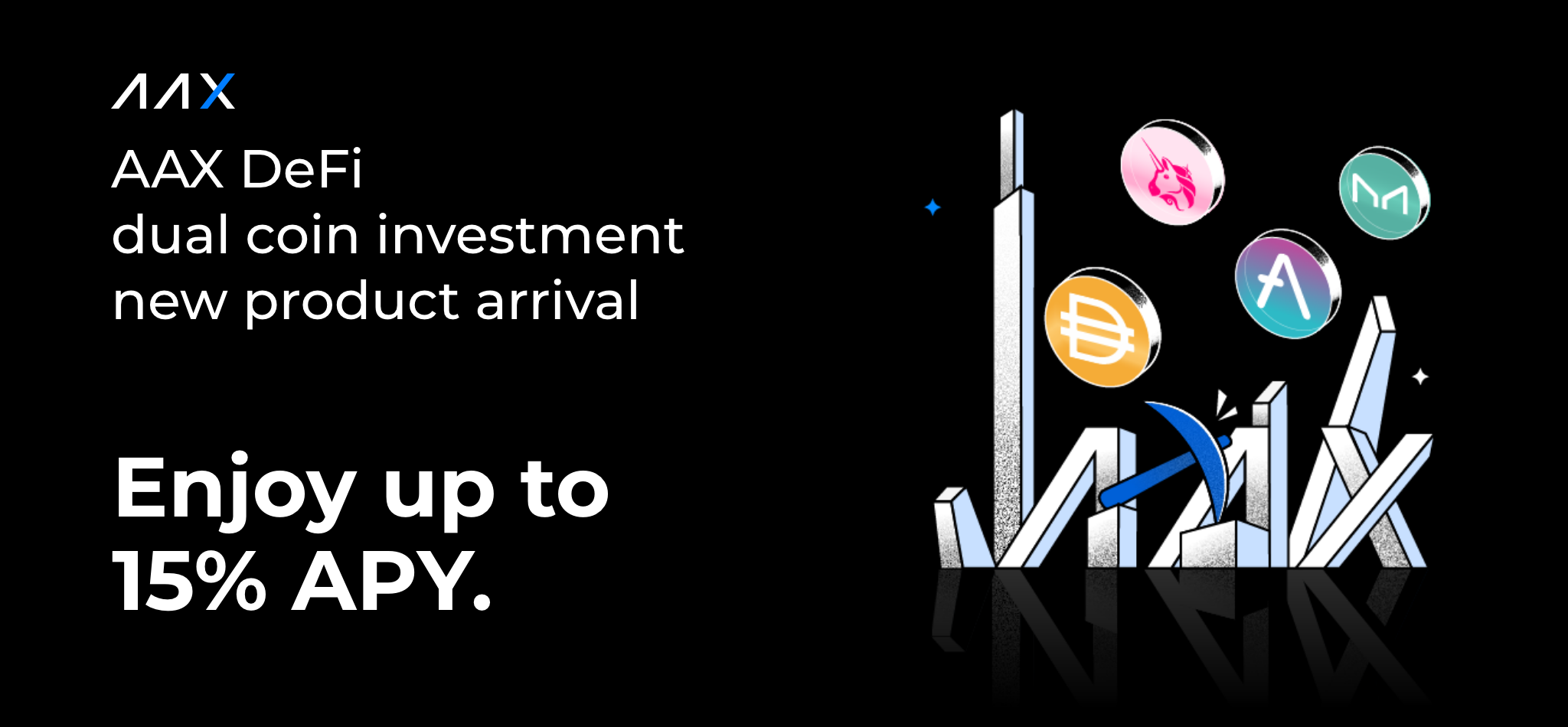 The new product, AAX DeFi Dual Coin Investment, was launched on May 04, 2022. You can subscribe to dual coin investment products to enjoy higher yields, up to 15% APY!