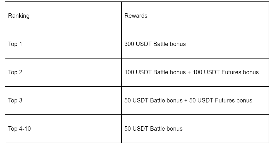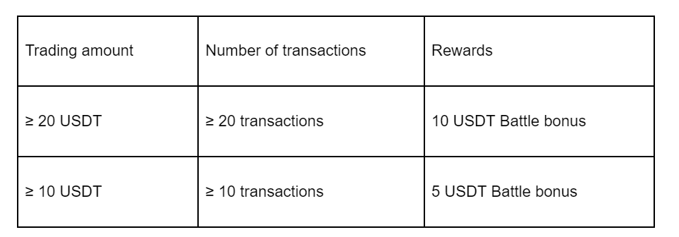 During the campaign, users who participate in Battle for the first time with the trading amount ≥ 20 USDT and trade ≥ 20 times can get up to 10 USDT bonus rewards. New users can enjoy the highest rewards once. For top 800 users only. First come, first served.