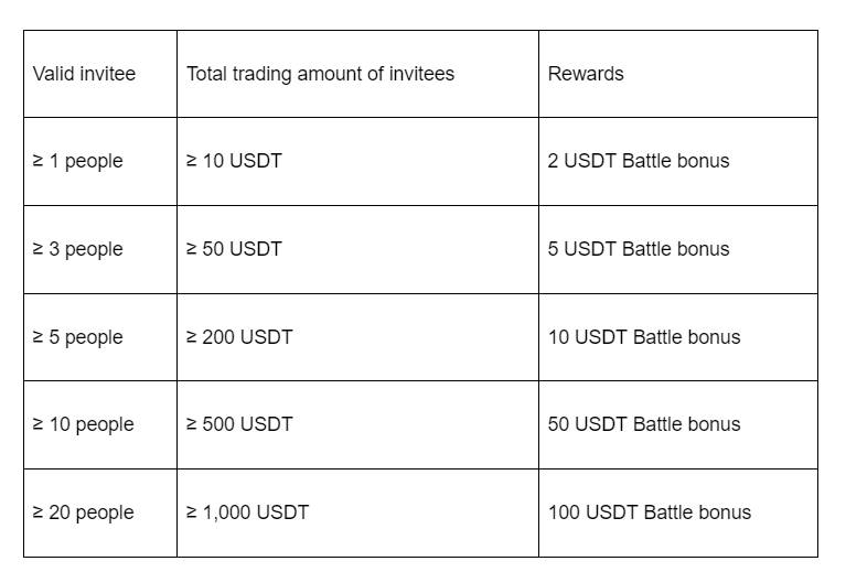 During the campaign, users can use the referral code/referral link to invite your friends to register and bet in Battle. It will be taken as an valid invitation only if the invitee’s accumulated Battle trading amount ≥ 10 USDT. Inviters will be ranked according to the number of valid invitees. The top 10 inviters can share 1,000 USDT rewards.