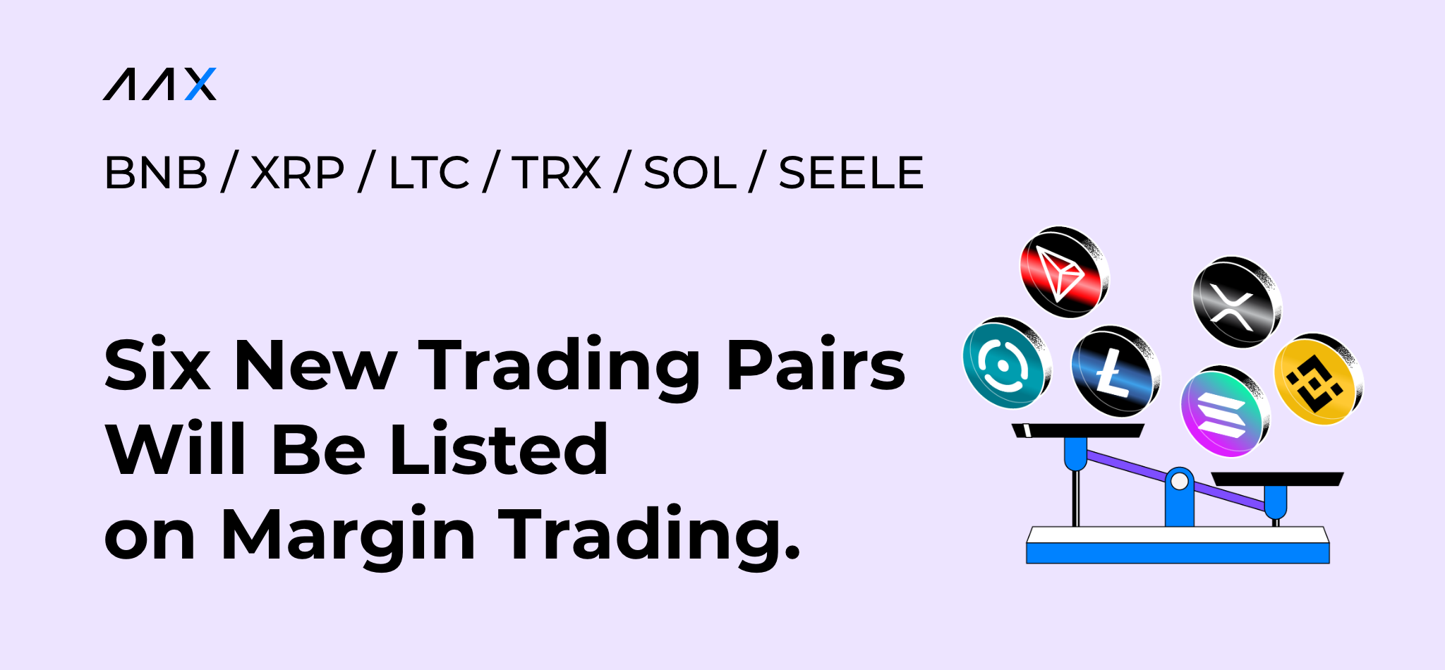 AAX Margin Trading will soon launch six new margin trading pairs, namely BNB/USDT, XRP/USDT, LTC/USDT, TRX/USDT, SOL/USDT and SEELE/USDT.