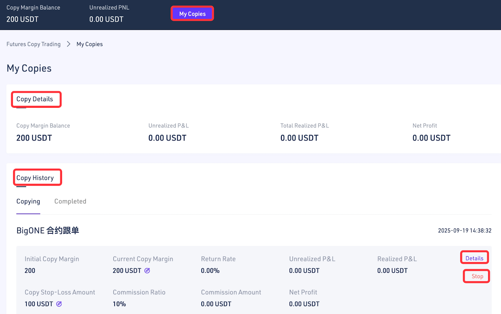 - View copy trading details and copy trading history in "My Copies." Click "Details" in "Copy Trading" to view your current position and trading history. Click "Stop" to end copying.