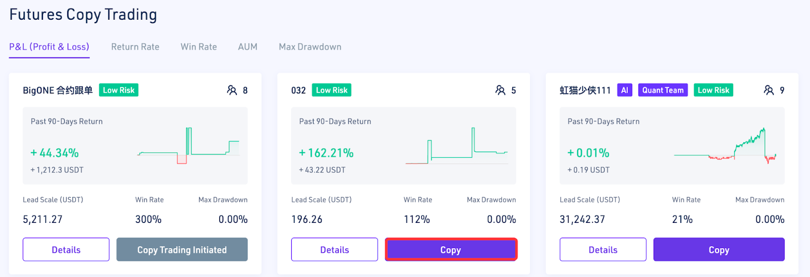 - Go to the Copy Trading page from "Home" - "Futures" - "Futures Copy Trading." Select the lead trader you want to copy and click "Copy."