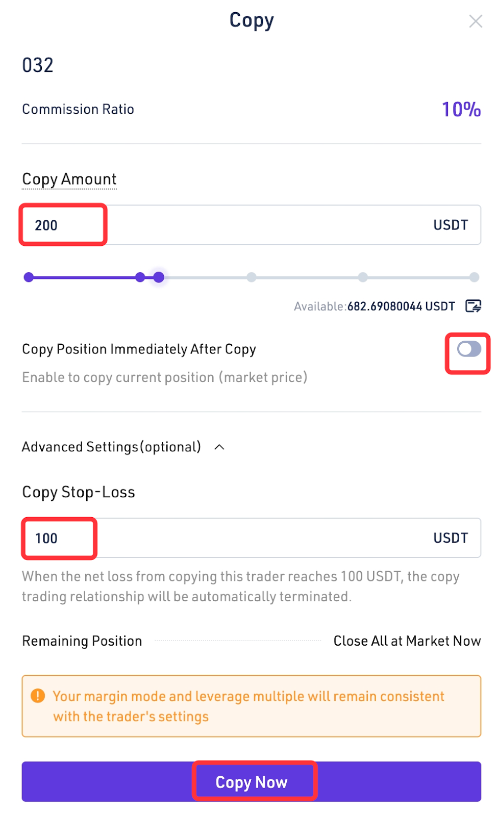 - Follow the on-screen prompts to enter the copy trading amount, choose whether to copy the position immediately, set a stop-loss amount (optional), and then copy the trade immediately. Funds invested in the copy trading will be transferred from your Futures account to your copy trading account. Please pay attention to fund fluctuations in your Futures account and position risk.