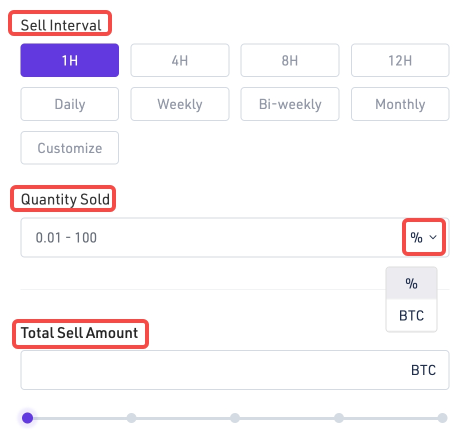 2. Select the selling interval, enter the quantity to sell each time (as a percentage or fixed amount), and enter the total quantity to sell. If no advanced settings are specified, and the selling interval is set to "daily," the sale will occur at 00:00 daily.