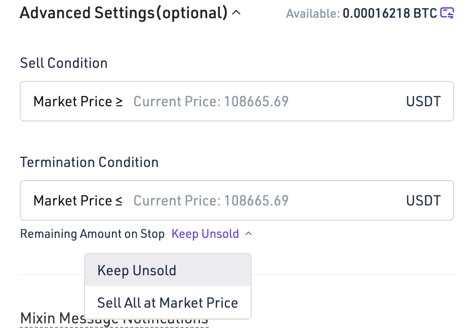 Selling Condition: Set the trigger price, the sale will only occur if the market price is greater than or equal to the set price.