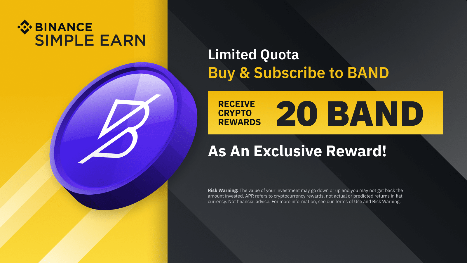 Binance Simple Earn has launched two new promotions for BAND on Locked Products. Complete subscriptions to BAND Locked Products from 2023-02-24 at 12:00 (UTC) to enjoy exclusive APR, and receive 20 BAND in rewards!