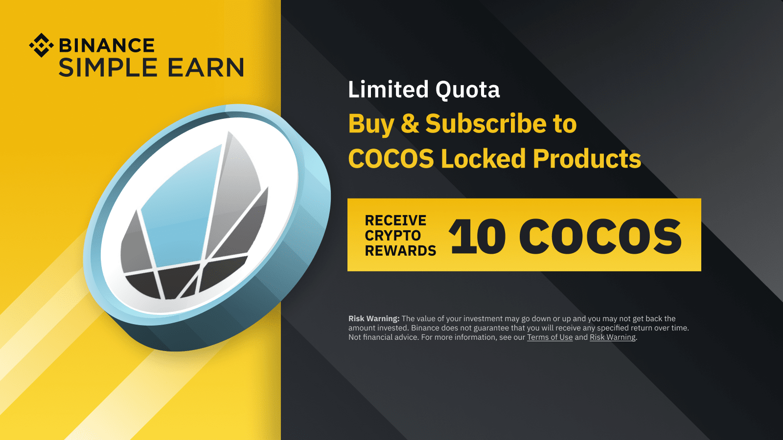 Binance Simple Earn is excited to launch a new promotion for COCOS on Locked Products! Complete subscriptions to COCOS on Simple Earn Locked Products from 2023-04-10 at 12:00 (UTC) to receive APR rewards daily and an additional 10 COCOS in rewards!