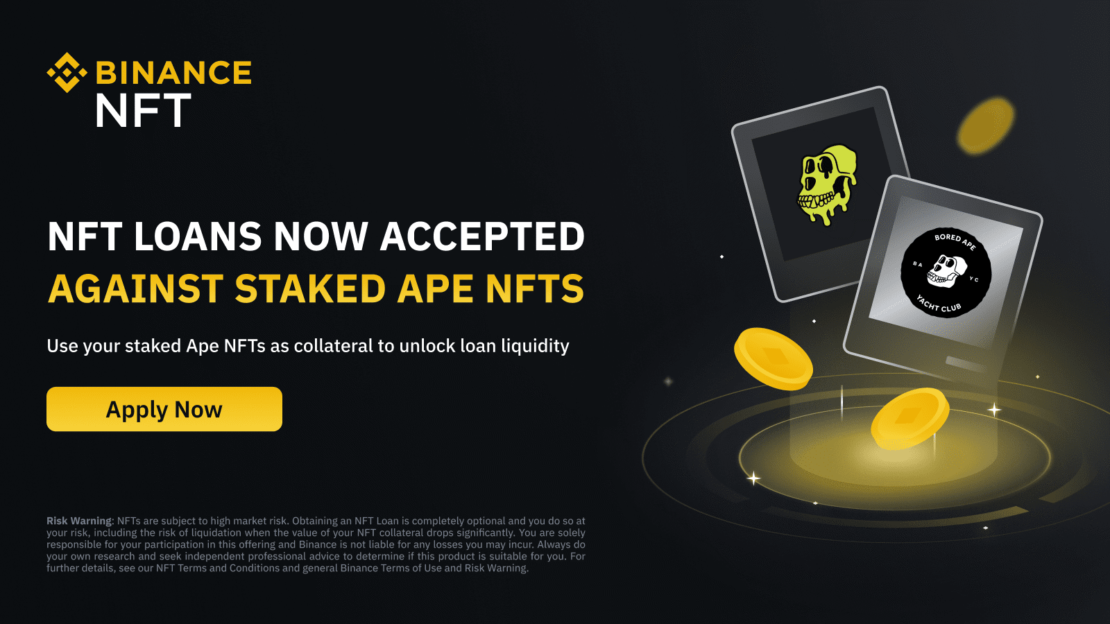 This introduces more flexibility for Binance NFT users, who can now stake their existing BAYC and MAYC NFT collateral on NFT Loan via the Ape NFT Staking Program to earn ApeCoin (APE) daily rewards, or gain access to higher liquidity by completing an NFT Loan with a staked BAYC NFT or MAYC NFT.