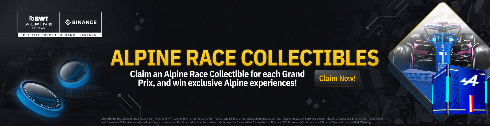 Binance Fan Token is announcing an exciting product - Alpine Race Collectibles. Eligible users who claim Alpine Race Collectibles from each Grand Prix will stand a chance to participate in exclusive Alpine experiences, including visits to BWT Alpine F1® Team’s factories, virtual meet & greet sessions with F1 drivers from the BWT Alpine F1® Team (i.e. Pierre Gasly & Esteban Ocon), and many more!