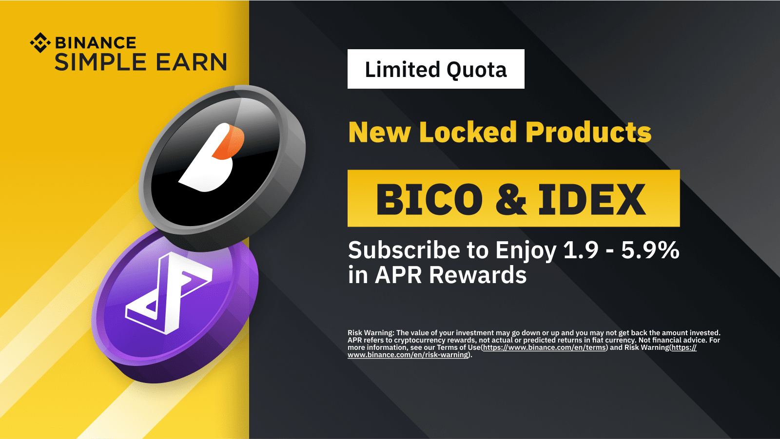 Binance Simple Earn is launching BICO and IDEX on Locked Products. Complete subscriptions to BICO and IDEX Locked Products from 2023-03-31 12:00 (UTC) to start earning rewards.