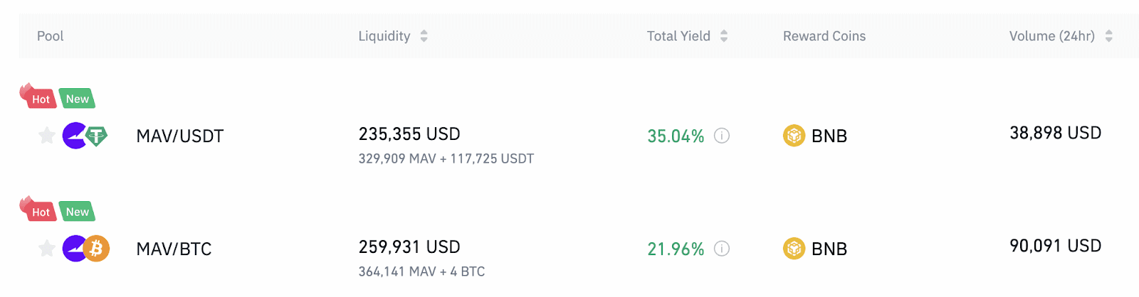 Users can still add liquidity to the MAV/USDT and MAV/BTC liquidity pools on Liquidity Farming to earn BNB rewards after the Activity Period. Increased BNB Rewards are limited, and will no longer be available after the Activity ends.