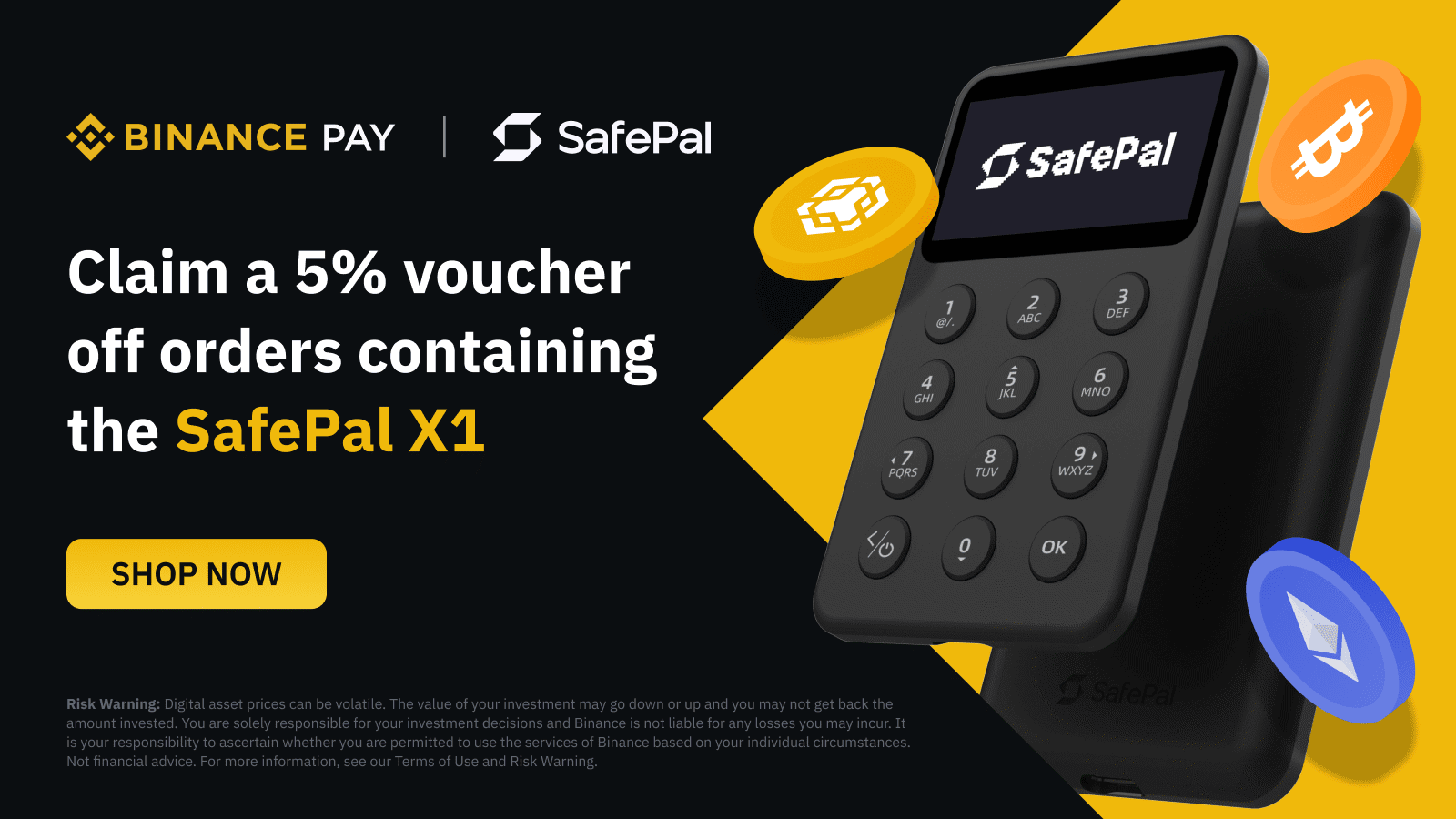 Only eligible users who are using Binance Pay and purchase the SafePal X1 on Binance Marketplace can apply the discount voucher.