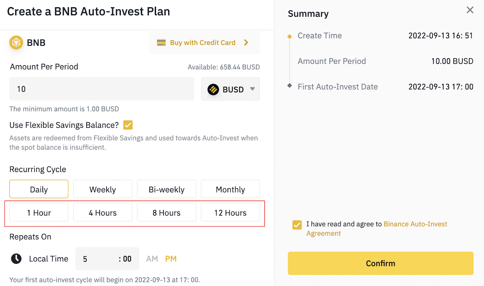 Binance is pleased to announce that Auto-Invest has enabled hourly plans, which provides users more flexibility as they automate their dollar-cost averaging investment strategy . Users are now able to complete crypto purchases using any of the available hourly plans on Auto-Invest (i.e, one hour, four hours, eight hours or 12 hours), as shown in the figure below.