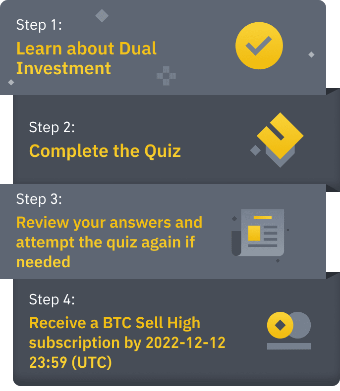 - Step 4: Qualified users will automatically receive their Dual Investment BTC Sell High subscriptions by 2022-12-12 23:59 (UTC).