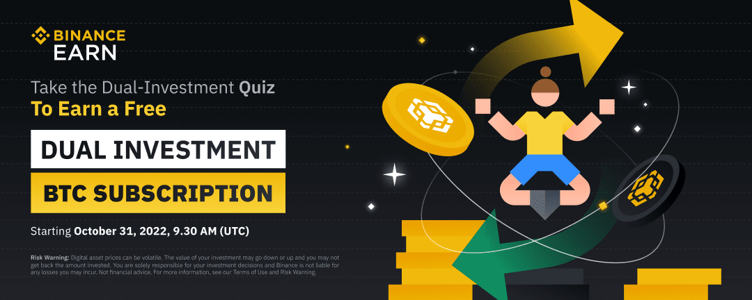 Binance is launching a new Dual Investment Quiz activity on 2022-10-31 at 09:30 (UTC), where users can gain knowledge about Dual Investment and Auto-Compounding. The first 100,000 new Dual Investment users who successfully complete the quiz during the promotion period, will be eligible to each receive a free Dual Investment BTC Sell High subscription.