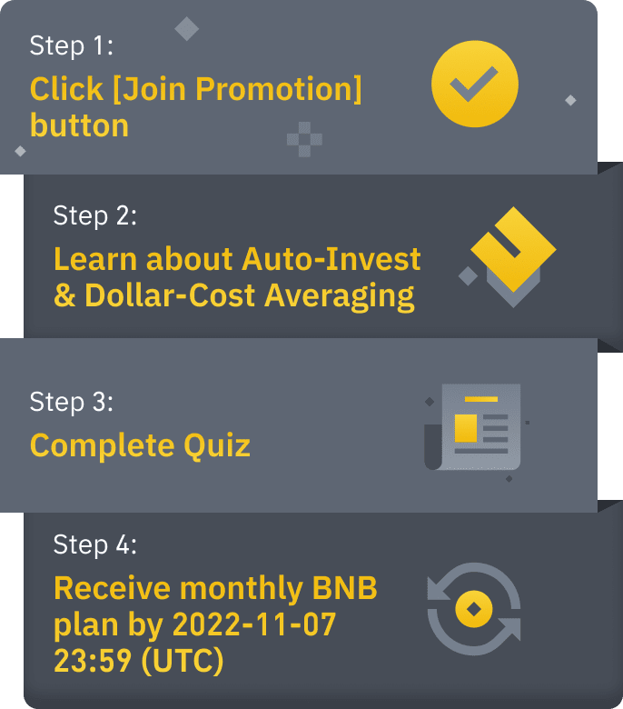 Binance is launching the Auto-Invest Quiz on 2022-10-03 09:00 (UTC), where users can gain knowledge about Dollar-Cost Averaging and Auto-Invest. The first 40,000 new Auto-Invest users who successfully confirm their participation and complete the quiz during the promotion period, will be eligible to each receive a free Auto-Invest BNB monthly plan for five months.