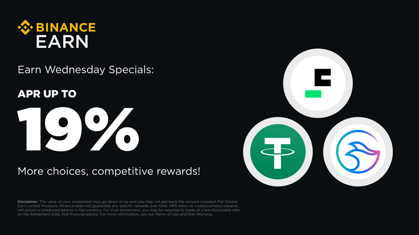 Binance Earn presents to you new offers that will launch each Wednesday. Stay tuned for Earn Wednesday to get rewards across Simple Earn, BNB Vault, ETH Staking, Dual Investment and more.
