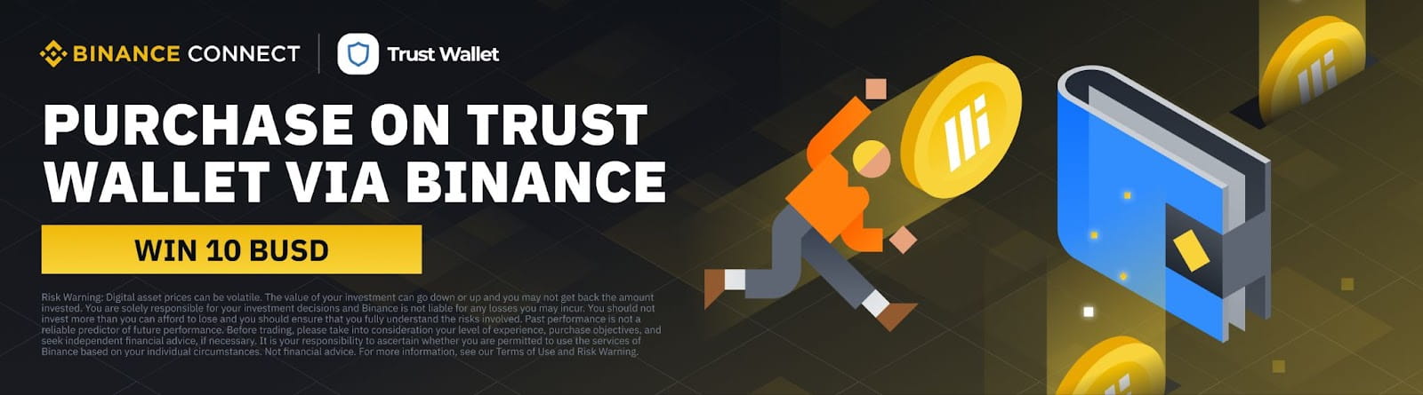 Binance is announcing a new promotion where eligible users can each receive 10 BUSD. For each day of the activity period, eligible users who complete their first crypto purchase of at least $20 equivalent on Trust Wallet via Binance Connect will stand a chance to win daily rewards on a first-come, first-served basis.