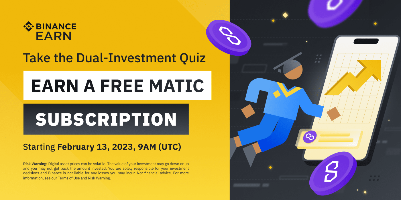Binance is launching the Dual Investment MATIC Quiz activity on 2023-02-13 at 09:00 (UTC), where users can gain knowledge about Dual Investment and Auto-Compounding. The first 100,000 new Dual Investment users who successfully complete the quiz during the promotion period will be eligible to each receive a Dual Investment MATIC Buy Low subscription.