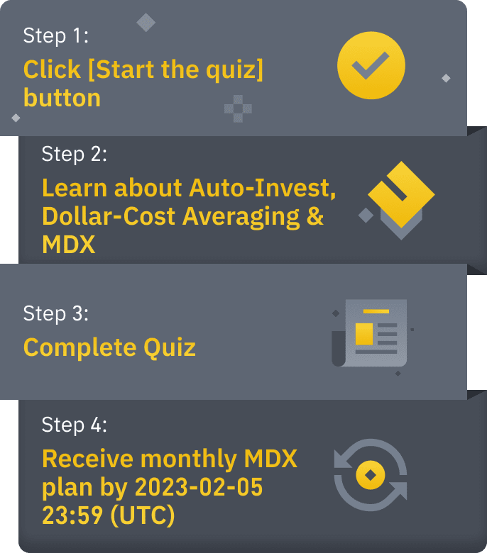 To celebrate the launch of MDX on Auto-Invest, Binance is launching the Auto-Invest MDX Quiz Activity on 2023-01-02 09:00 (UTC), where users can gain knowledge about Dollar-Cost Averaging (DCA), Auto-Invest and MDX. The first 100,000 new Auto-Invest users who successfully complete the quiz during the promotion period, will be eligible to each receive a free Auto-Invest MDX monthly plan for five months.