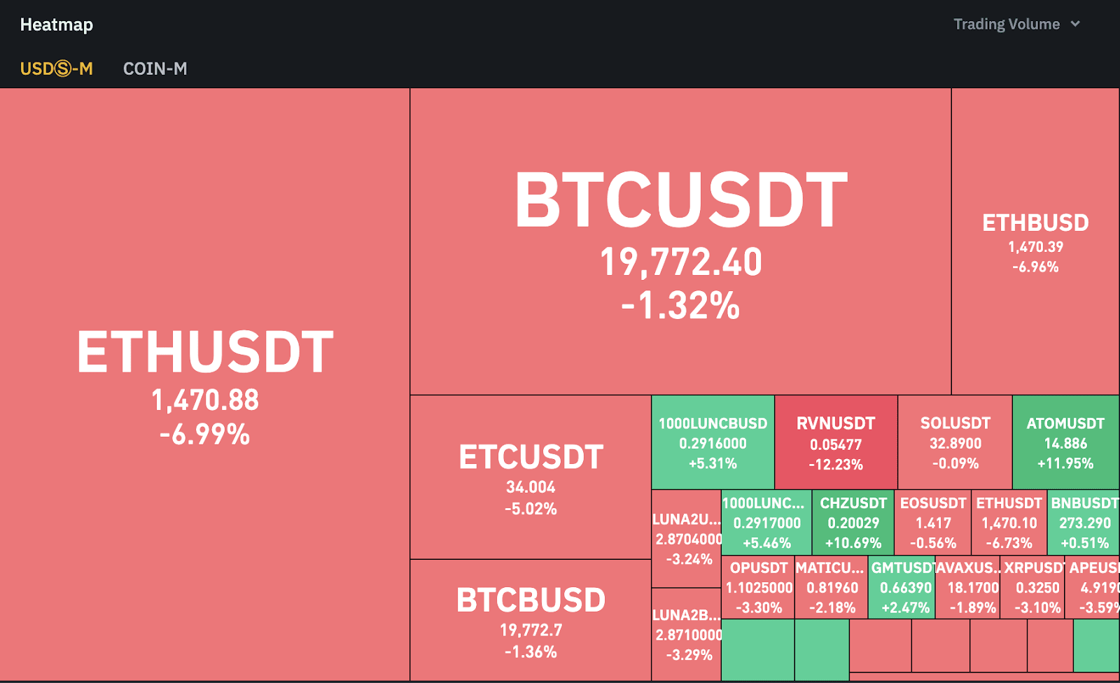 Binance has launched the heatmap widget on 2022-09-07 (UTC), which displays the top 30 USDⓈ-M or COIN-M Perpetual Contracts in Binance Futures. The heatmap shows real-time data in the form of blocks that are automatically organized by trading volume and percentage price change, using a color scheme that reflects rising or declining trends.