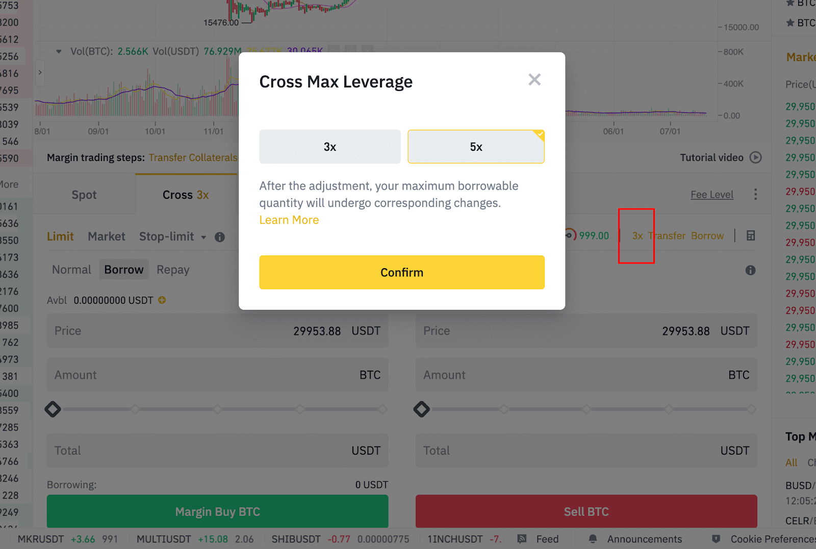 Please note that the maximum leverage for newly created Cross Margin accounts will be set to 5x by default, and users can manually adjust the leverage to 3x or 5x, as shown in the screenshot below. The maximum cross margin borrowing limit is based on the leverage selected by users. Users are strongly advised to maintain their Margin Levels above 1.1 in order to avoid any potential liquidation.
