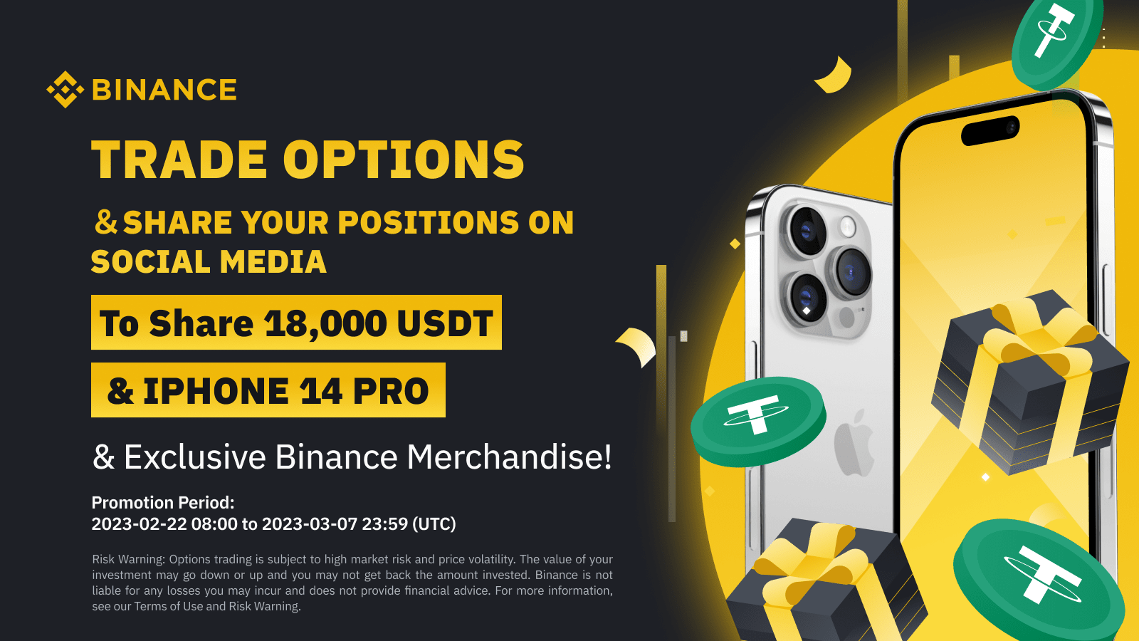 Trade Options & Share Your Positions on Social Media to Share 18,000 USDT, an iPhone 14 Pro & Exclusive Binance Merchandise!