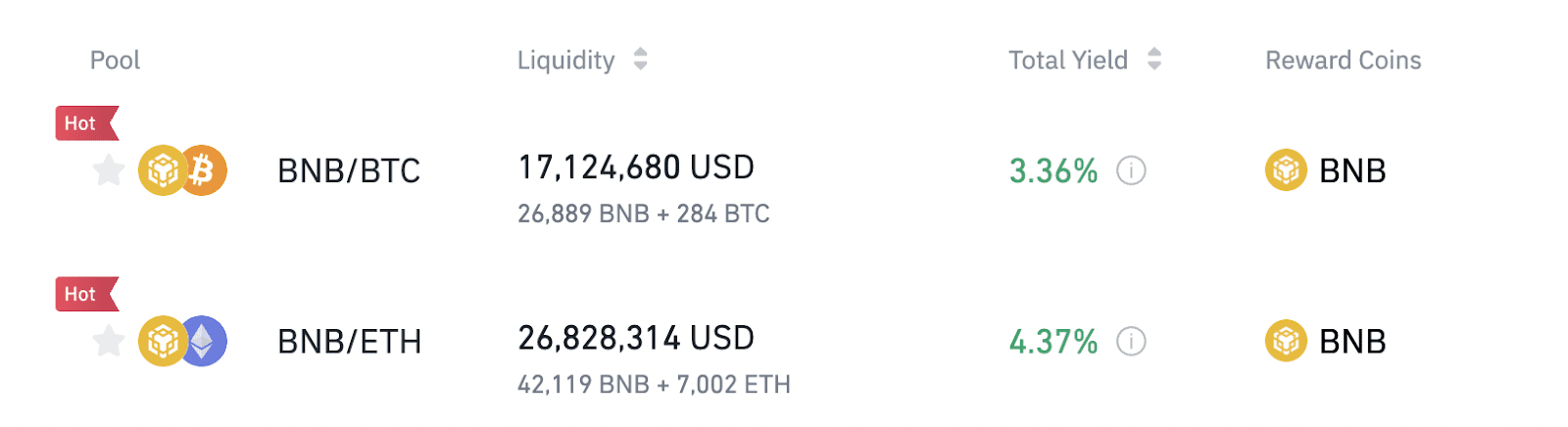 - Users may enjoy increased BNB rewardswhen adding liquidity to the BNB/BTC and BNB/ETH liquidity pools during the Activity Period, and continue to enjoy standard rewards when the activity ends. Users may refer to the overall rewards breakdown of each liquidity pool under Total Yield.