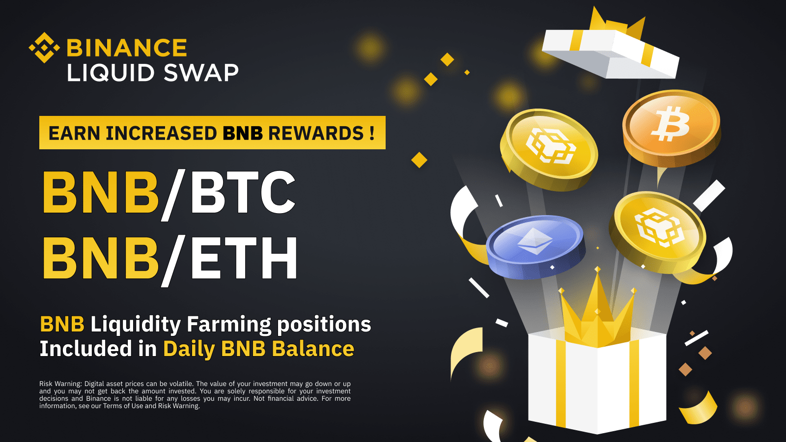 During the Activity Period, all users will stand to receive increased BNB rewards on top of the standard rewards when adding liquidity to the BNB/BTC and BNB/ETH liquidity pools.