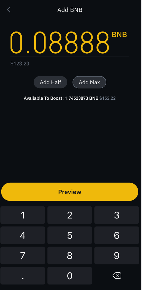If you have an adequate balance, enter the amount you would like to add. Tap Preview to proceed, then Confirm to Boost your crypto.