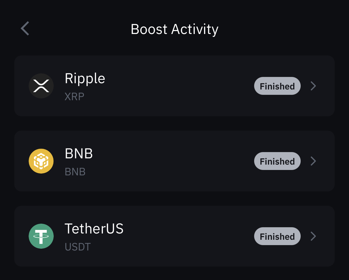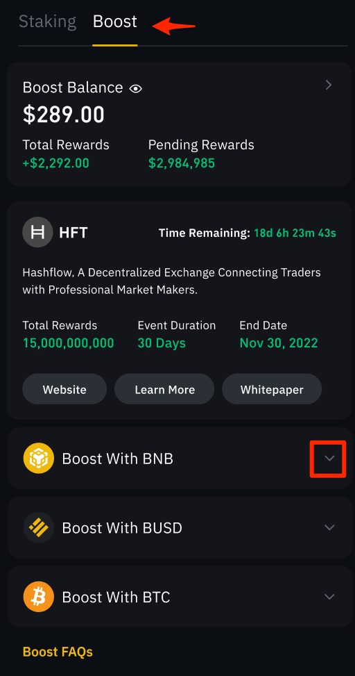 2. Eligible cryptocurrencies for an event are listed under the event description. Select which eligible cryptocurrency you would like to add by tapping on the Boost with cards.