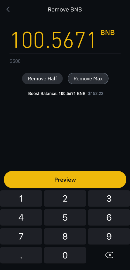 4. Enter the amount you would like to remove and tap Preview to proceed, then Confirm to remove your crypto from Boost.