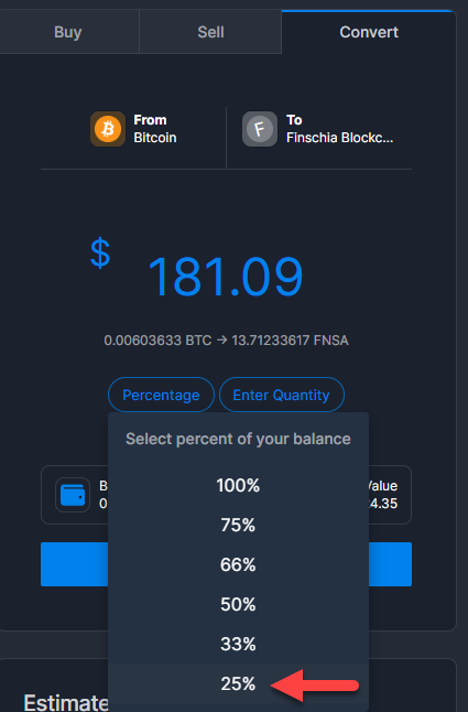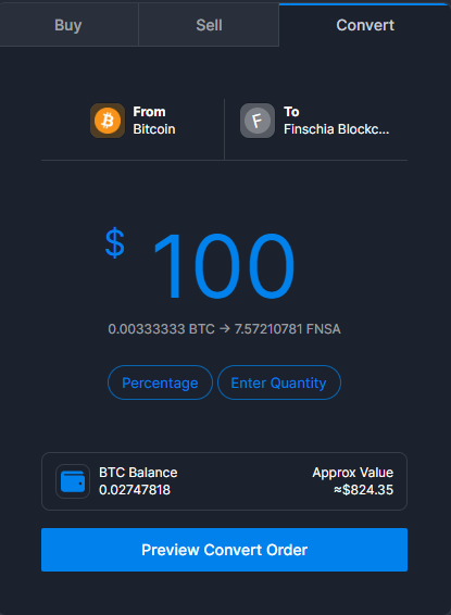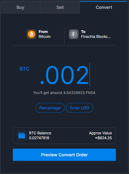 - In the example below we convert 25% of our total BTC holdings to FNSA.