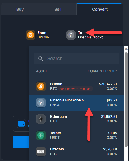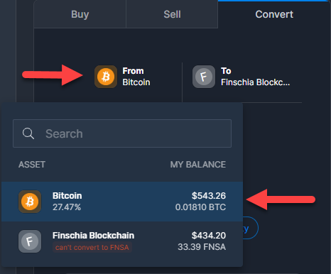 Next, choose the crypto you would like to convert your selected cryptocurrency into by selecting the ‘To’ tab. In the example below we chose to convert BTC to FNSA. If the two currencies you would like convert don't have market with a common quote currency or a direct market, then you cannot convert between the two. If you cannot convert, we will show you a "can't convert" message.