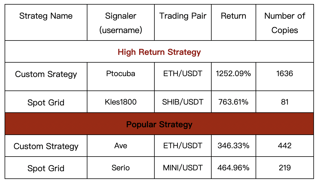 Users can view the performance of strategies created by other users in the leaderboard, and if they think a strategy has a better return than their own, they can copy a creator's strategy parameters to create an individualized version. All strategies are free to copy and 5% of the earnings will be returned to the signaller after the strategy is terminated.