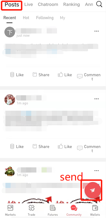 Mobile App: log in to the latest version of App - select "crypto space" below to enter the “Posts” page.