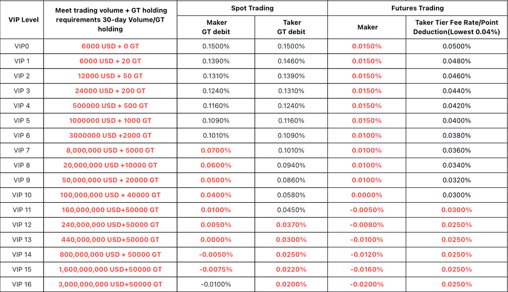 Gate.io's new trading fees structure not only lowers the threshold of increasing users' VIP level for all stage users, but also lowers the trading fees for each VIP level. For Gate.io’s new trading fees, please refer to the table below: