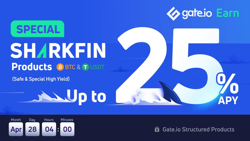 Gate.io will launch a Daily BTC & USDT SharkFin SPECIAL Product with an annualized yield of 3%~25%. It will be available for subscription starting from 4:00 on April 28th to 10:00 on April 30th UTC. The total position reaches 300 BTC and 8,000,000 USDT, the lock-up period is 7 days, and the price range is $38,500 - $42,500. You're welcome to participate!