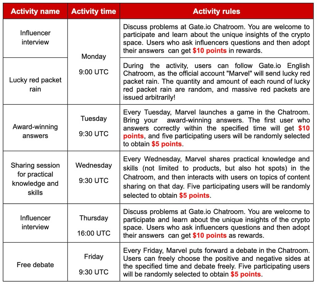 In order to improve users' performance in Gate.io Chatroom experience and provide better quality service, Gate.io Chatroom will launch different intriguing interactions with Gate.io official account "Marvel-N-Wonder" from Monday to Friday. Users who participate in the interaction will have the opportunity to obtain rich rewards. After the interaction, Gate.io will issue corresponding rewards to the winning users according to the activity rules and award conditions below.