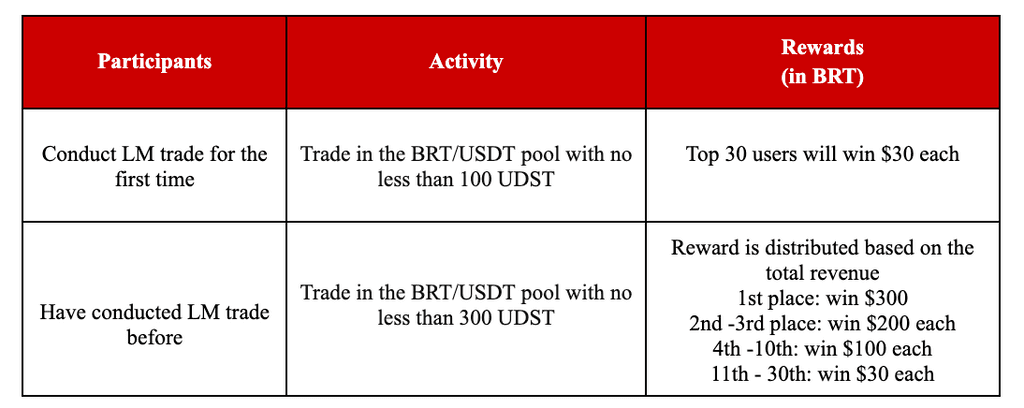 During the event, users who make a transaction in the BRT/USDT mining pool will have the opportunity to get the current exclusive token reward (BRT).