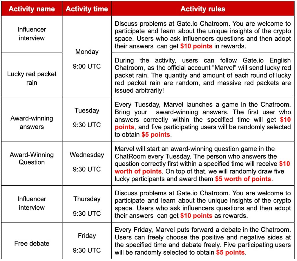 In order to improve users' performance in Gate.io Chatroom experience and provide better quality service, Gate.io Chatroom will launch different intriguing interactions with Gate.io official account "Marvel-N-Wonder" from Monday to Friday. Users who participate in the interaction will have the opportunity to obtain rich rewards. After the interaction, Gate.io will issue corresponding rewards to the winning users according to the activity rules and award conditions below.