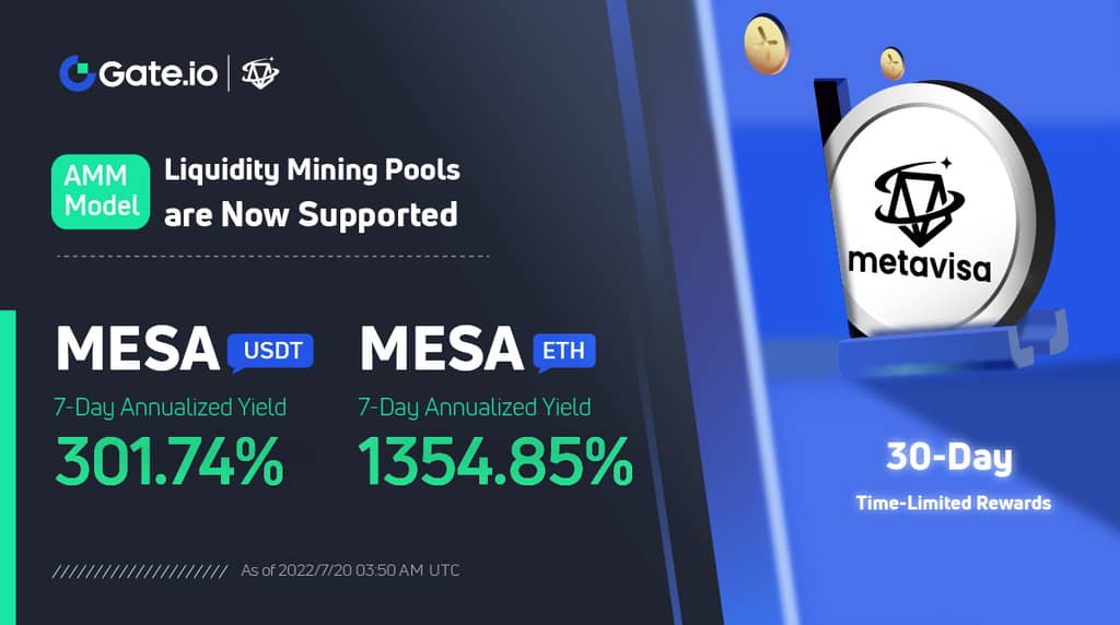 Trading pairs (MESA/USDT & MESA/ETH), a new version of the liquidity mining pool bonus (Automated Market Maker AMM), are officially enabled on Gate.io. Moreover, an extra time-limited bonus of 395,022 MESA was added to them at 5:00 (UTC) today.