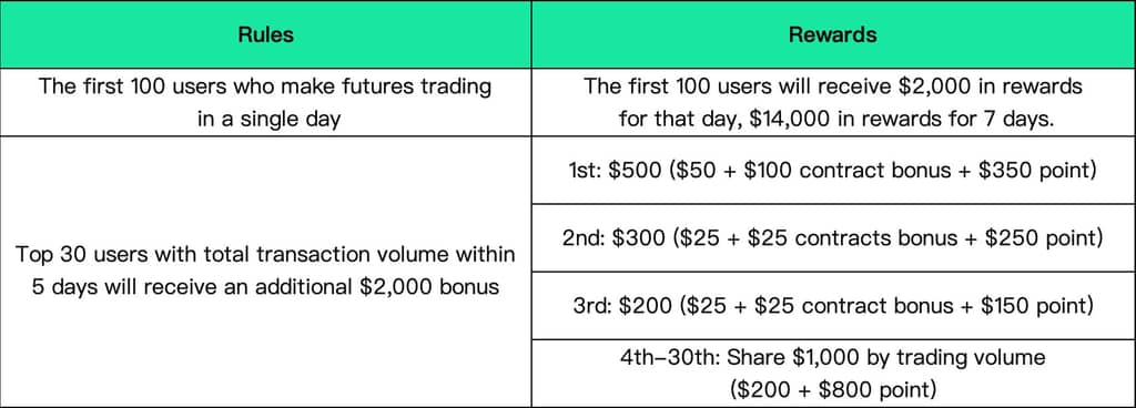 During the event, new and existing users with a daily contract transaction amount ≥ 3,000 USDT will be considered to have reached the trading volume target for that day! Trade Now