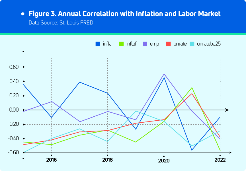 2. The correlations between Bitcoin returns and labor market statistics are all rising from 2015 to 2021 and dropping sharply in 2022, especially the correlation with the unemployment rate of people with bachelor's or higher degrees and ages over 25.