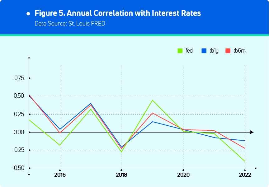 3. The correlation in the interest rate category is all negative, suggesting the risky nature of Bitcoin returns. This could be caused by strong interest moves by the Federal Reserve to control inflation.
