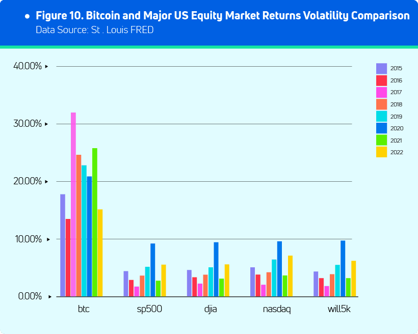 5. Bitcoin returns volatility is significantly higher than that of the major US equity markets which means Bitcoin is far riskier.