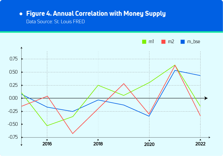 This figure shows the correlation trend between Bitcoin returns and money supply. It is clear that the correlation levels are rising through 2015 and 2021. The correlation peaked in 2021 and soon turned down in 2022. The downturn in 2022, could be just an adjustment of an upward trend, like many before. Or it is simply due to the lack of data in 2022. This trend also shows that Bitcoin's behavior resembles that of a risky asset, with a positive correlation to money supplies.